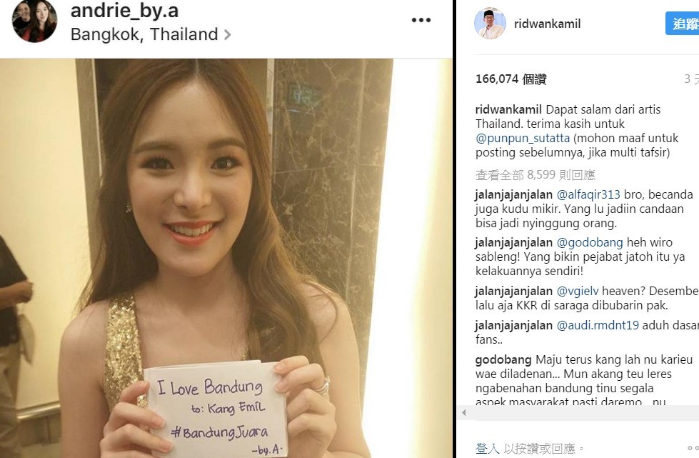 泰國當紅女星芳芳(Punpun Sutatta)日前手持一張寫著「我愛萬隆」的字卡拍照,疑似公開向印尼萬隆市長卡米爾(Ridwan Kamil)告白,在網路上引發熱議,沒想到對方看到照片後卻反問,「希望妳不是男生」,隨即遭到泰國歌迷強烈抗議,要求市長為他的不當言論道歉。