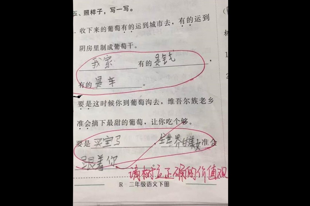 這次這孩子竟寫出「要是買寶馬,全世界的美女準會跟著你。」看到學生接連造出這樣的句子,連老師也看不下去,直接用紅筆寫出「請樹立正確的價值觀。」
