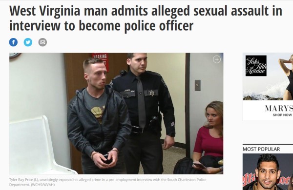 美國西維吉尼亞州(West Virginia)南查爾斯頓市(South Charleston)一名21歲的男子普萊斯(Tyler Ray Price),2月間到當地的警局應徵警察一職。沒想到在面試過程中,他卻自爆曾性侵過一名女子,警方當場將他逮捕,並以二級性侵罪起訴。