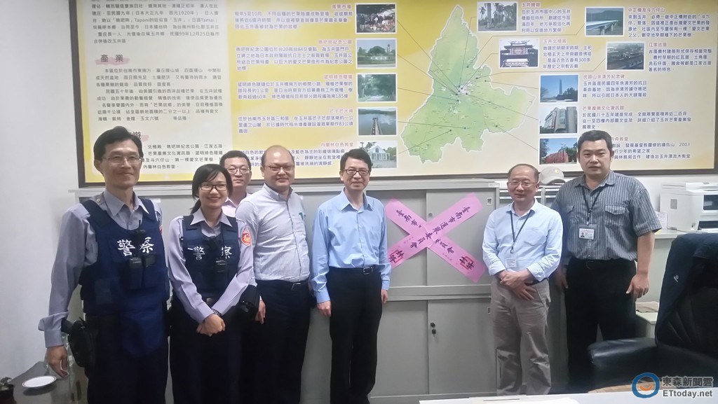 玉井分局長楊華中在17日上午9時與玉井區公所區長張文榮共同視察選票印製、點領及存放安全維護工作,並慰勞執勤員警與工作人員辛勞。