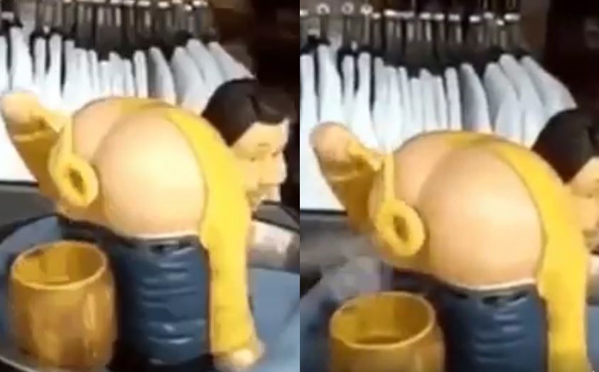 影片中,這個玩偶頂著由頭,還稍稍側向右邊,露出了一某詭異的笑容,身上穿著一見黃色長袖,下半身則的牛仔則是褲只穿一半,露出半顆屁股,再往他手邊一瞧,左手的位置在屁股前方,還握著一個黃色的吹泡泡工具,只見他不停上下擺動,這時從肛門就像是放屁一樣吹出氣體,泡泡也同時吹出。