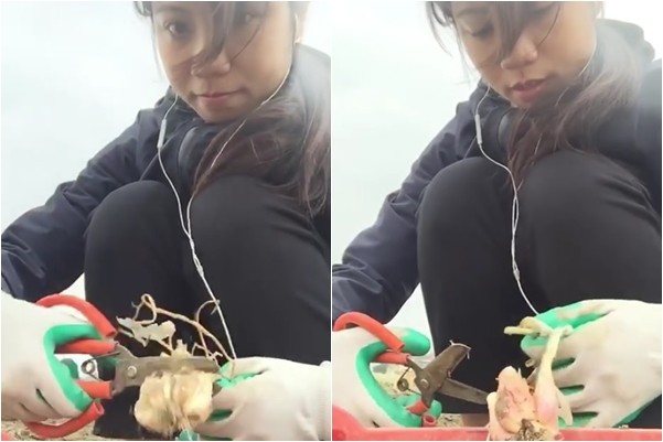 ▲女子坐在田裡剪紅蔥頭,還不到20秒就把耳機線剪斷。(圖/翻攝自爆料公社粉絲團)