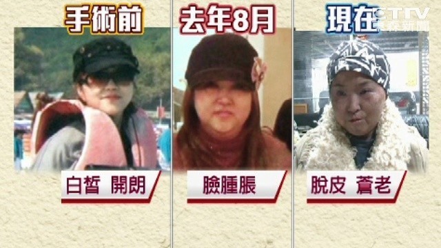 陳女2011年檢查出罹病,聽林口長庚醫院的王姓醫師建議,進行造血幹細胞移植,結果出現嚴重排斥病變,原本白皙的皮膚紅腫潰爛、發黑、指甲脫落,雙手還會不自覺顫抖,生活無法自理,外表宛如70歲,和男友出門被當成他的阿嬤。