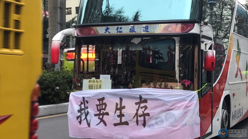 遊覽車外觀上掛滿「鴨霸部長、我要生存、還我財產」等字語,遊覽車玻璃窗上更寫下趕盡殺絕、我要活命等言詞,控訴交通部未審先判,讓他們頓時失去生財工具。另外,現場也有5部小客車繞行,車上同樣也掛上抗議布條,他們則代表的是車牌已被吊銷而不能來抗議的車輛。