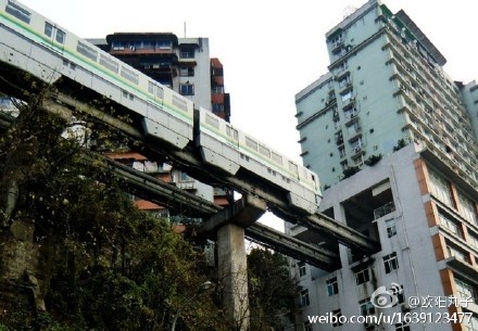 ▲由於地形複雜,重慶輕軌2號線在李壩子站採取穿越高樓的方式。(圖/翻攝自歐陽丸子微博)
