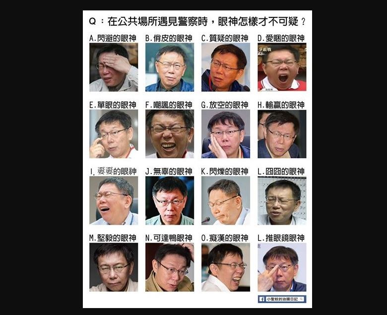 ▲網友蒐集柯文哲16種特殊眼神,搞笑製圖酸「很可疑」。(圖/翻攝自小聖蚊的治國日記)