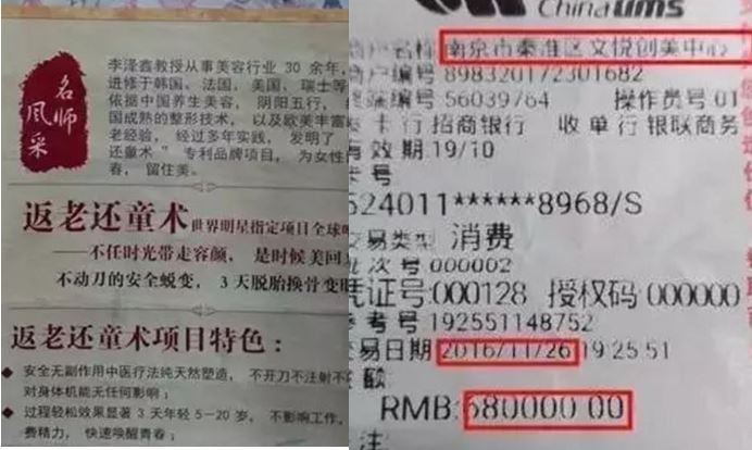 據《北京青年報》報導,文姓婦人提供的一張刷卡單顯示,刷卡日期為:2016年11月26日,金額為68萬元人民幣,她的手機中有張照片是一份宣傳廣告,上面寫著「李教授依據中國養生美容、陰陽五行,結合韓國成熟的整形技術及歐美豐富的抗衰老經驗,經過多年實驗發明了『返老還童術』專利品牌項目,聲稱不開刀不注射不吃藥,3天年輕5-20歲。」
