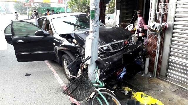 從路口監視器可以看到,一輛黑色轎車從路口急駛而來,卻在轉彎處失控,突然撞上一旁的機車騎士,卻沒有馬上停車,反而一路往前衝,直到撞上民宅才停下來,轎車前方都被撞凹,卡在電線桿前,機車卡在轎車車底、零件噴飛,連騎士的安全帽都被壓碎,但這時下車的卻是4名才14歲的少年。