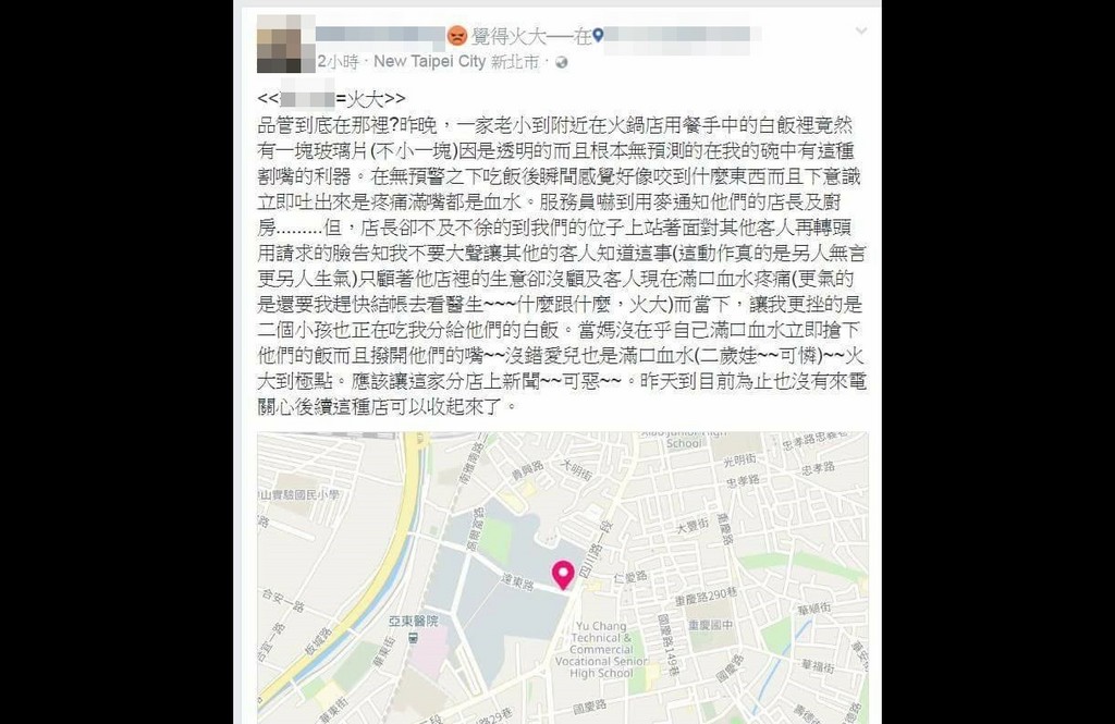 結果,店長過來的第一件事並沒有道歉,而是要求不要出聲,別讓其他客人知道,並且請服務生倒冰水來漱口,確認他們沒有繼續流血,就好像沒事般的詢問「還需要白飯嗎」,並且要求趕緊結帳離開,不但沒有提供任何補償,事後更完全沒有電話關心或道歉,一直到昨日晚間才接到店長電話要求見面。
