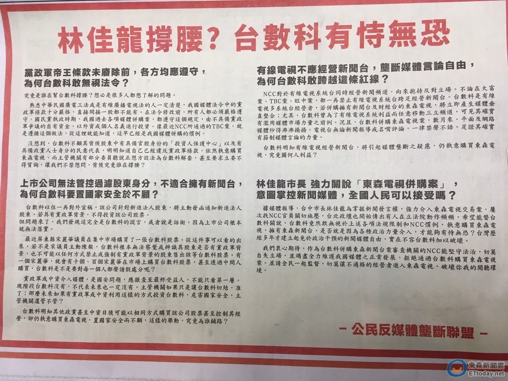 「台數科收購東森電視案」目前正在國家通訊傳播委員會(NCC)審查,「公民反媒體壟斷聯盟」今天(22日)再度在平面媒體刊登廣告,質疑台數科購買東森電視有恃無恐,是因為背後有台中市長林佳龍在撐腰?「公民反媒體壟斷聯盟」期盼NCC能堅守法治,切莫自失立場,並竭盡全力維護我國媒體正常發展,拒絕通過台數科購買東森電視案。
