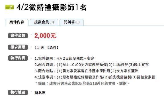 呂秋遠22日在臉書PO出一張網站截圖,內容清楚寫明「急件」,要在4月2日徵求1名婚禮攝影師,地點在蘆洲,必須有婚禮記錄經驗和作品,還得配合早上10點到男方家迎娶準備、11點迎娶,以及晚上的宴客,並拍攝全家福,甚至在拍攝結束後進行後製,但綜合上述種種要求跟內容,卻僅開價新台幣2000元。