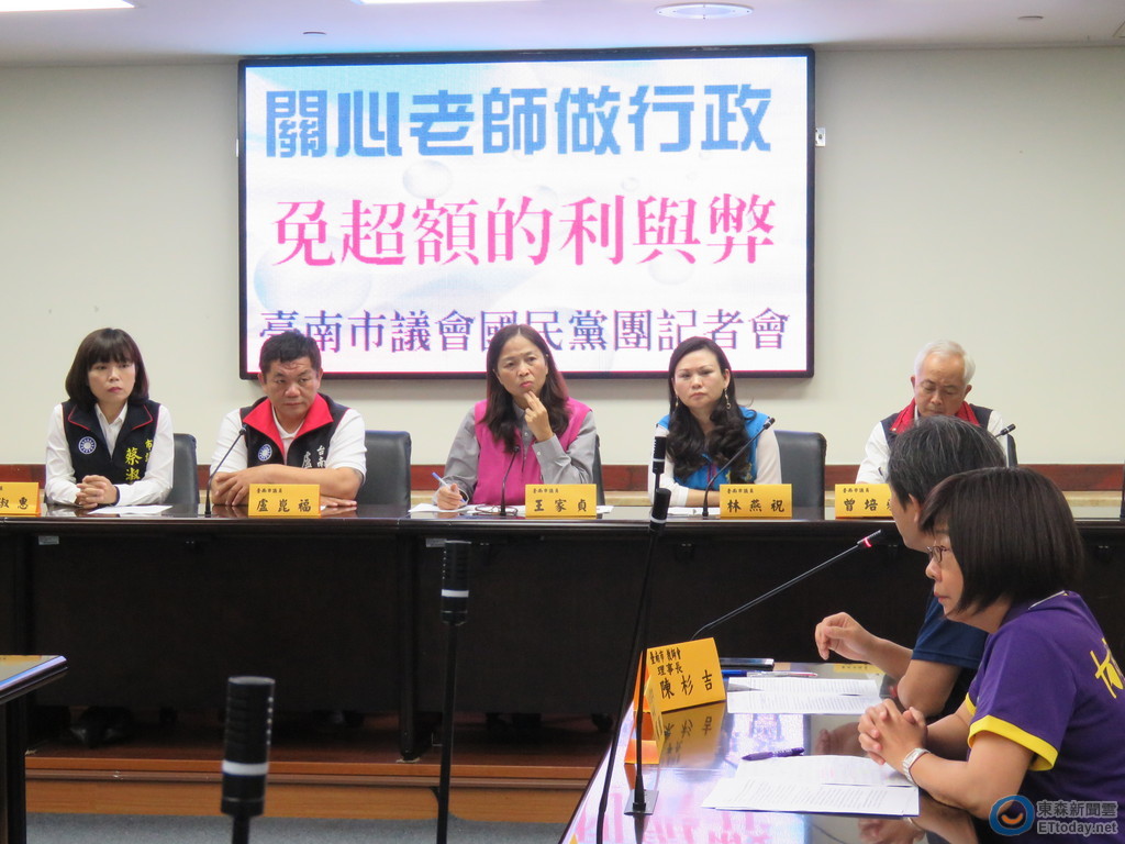 國民黨團議員蔡淑惠、盧崑福、林燕祝、曾培雅辦公室主任和議員林美燕秘書,與書記長市議員王家貞,仔細聆聽老師、校長團體和教育局的心聲。教師協會理事長陳杉吉、教育產業工會副理事長許珮甄指出,全台南市80幾所國中已有30幾所因地制宜訂有免超額辦法,教育局無權綁架每所學校,況且106年實施免超額法令,教育局並沒有通知擔任教師介聘委員的他們與會,而且老師不願兼任行政主因是要寫計畫、報成果、參加競賽和各種評鑑,忙到無法休假,結果台南市不休假加班費居然只有3天,比借調在市政府的老師1年7天還少。