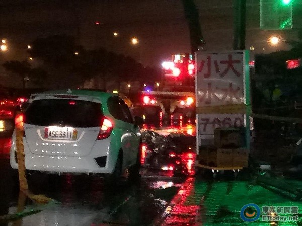 ▲拖吊肇事公車後員警才能搜證被撞的檳榔攤。(圖/記者楊熾興攝)