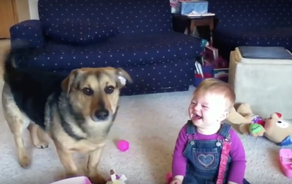 ▲被狗狗逗樂的小女嬰。(圖/翻攝自YouTube/Jess0rT,下同)
