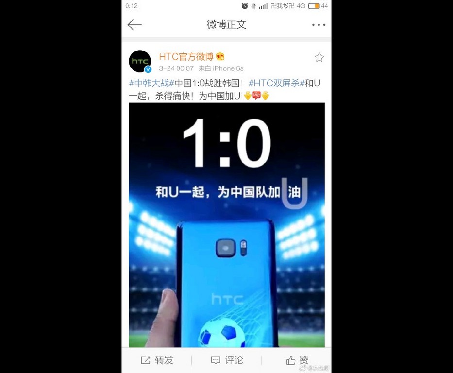 HTC官方微博於24日凌晨12時許發文,寫著「HTC雙屏殺,和U一起,殺的痛快!」等宣傳文字,搭配HTC U Ultra手機照片,雖然看似很正常,但是仔細一看發現,下方顯示著「iPhone 6S」,雖然文章已經緊急刪除,但許多網友已經截圖紀錄。