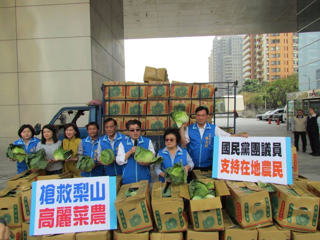「吃當季、食當地,歡迎大家一起吃又脆又甜的梨山高麗菜!」國民黨台中市議會黨團打出口號,要搶救梨山菜農,表示目前高麗菜嚴重滯銷,不忍看著農民辛苦的心血爛在田裡,決定幫台中市民促銷高麗菜。在副議長張清照號召下,以每箱8-10顆高麗菜、150元的價格,成功團購300箱、共6000公斤的高麗菜。