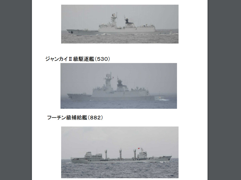 綜合日本媒體報導,根據日本防衛省統合幕僚監部23日發布的資料,這3艘中共軍艦分別為兩艘054A型飛彈護衛艦(徐州艦、舟山艦),以及905型運輸補給艦(鄱陽湖艦)。