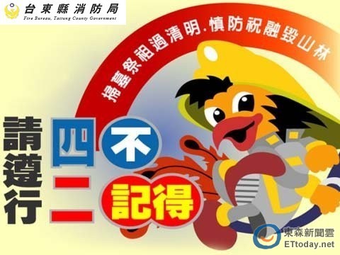 「火苗總因無心而起,防災總是有備而得」,清明掃墓防火災,台東消防局呼籲民眾掃墓祭祖時謹記「四不二記得」原則。 (一)祭祀時: 1、不亂燒雜草。 2、不亂丟煙蒂。 3、不讓冥紙飛揚。 4、不燃放爆竹。 (二)祭祀後: 1、「記得」撲滅火源,就可以避免星星之火的燎原 降低災害的發生。 2、「記得」隨手將垃圾帶走,還給山林及祖先一個潔 淨又美麗的綠地。