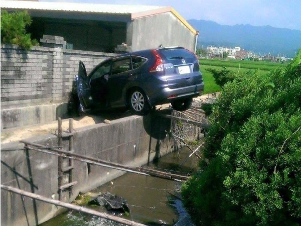 有網友在臉書社團「爆廢公社」po出一張照片,並且發文提到「三寶無所不在!」從照片中看到,這輛休旅車不知道什麼緣故,竟然飛越了排水溝,車頭直接撞到了民宅外面的圍牆。更誇張的是車子後輪後輪「站」在大排水泥護牆,車尾整個翹起,如此誇張景象讓人看了嘖嘖稱奇,直言真不敢相信。