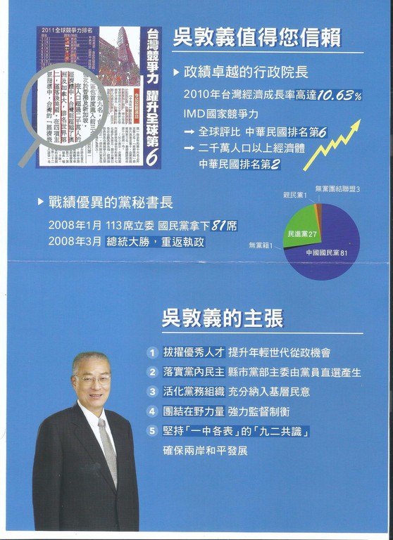 雖然日前連署書受到「人頭黨員」的風波,不過吳敦義仍舊行程滿檔跑。他近日一一將連署書寄出,內容中大打經國牌,以表達他早年受到經國先生對台籍青年的栽培。但他強調,未來不會以省籍做區分,也絕不會為了勝選讓黨分裂;他一路從縣長到院長,更沒有任何一級主管貪污舞弊,因此執政成績覺得經得起考驗。