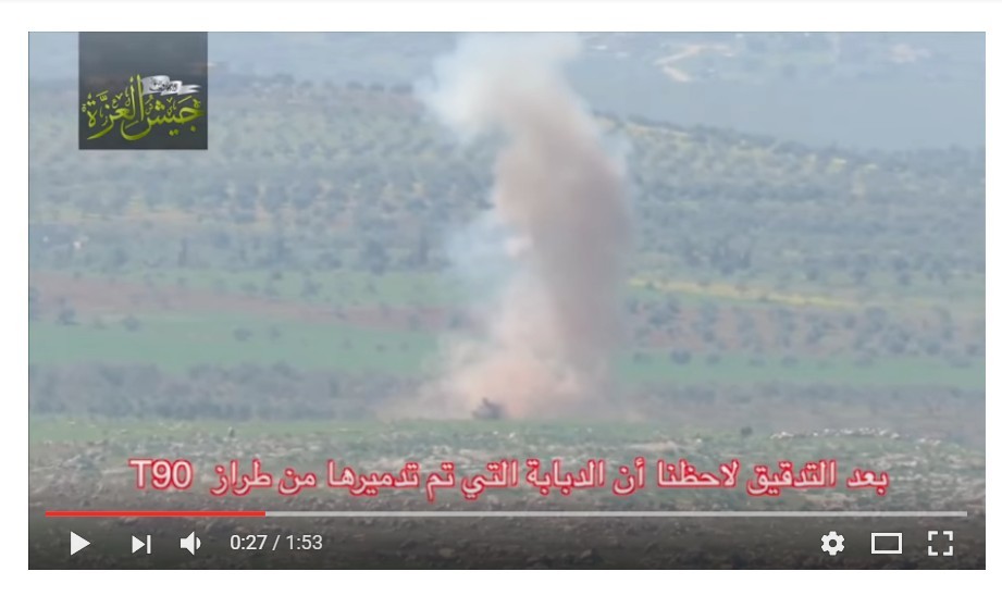影片中可看到,這枚能貫穿深超過1000毫米的飛彈準確命中「T-90主戰坦克」,立即造成巨大的火球及濃煙,然而飛彈並沒有成功穿刺坦克,後來可見到3名操作坦克的敘利亞士兵急忙爬出駕駛艙逃離。有俄媒指出,T-90坦克之所以沒有被摧毀,是因為配備「反應裝甲」保護,才沒有像其他「前輩」一樣落得人車均毀的下場。