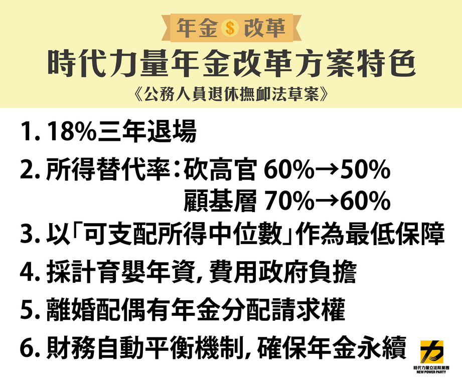 時代力量年金改革方案共有六大重點,分別為一、18%三年退場(歸零);二、所得替代率「砍高官」(10年內60%降至50%)「顧基層」(10年內70%降至60%);三、樓地板以「全國每人可支配所得中位數」作為最低保障;四、採計育嬰年資,費用政府負擔;五、離婚配偶有年金分配請求權;六、財務自動平衡機制,確保年金永續。
