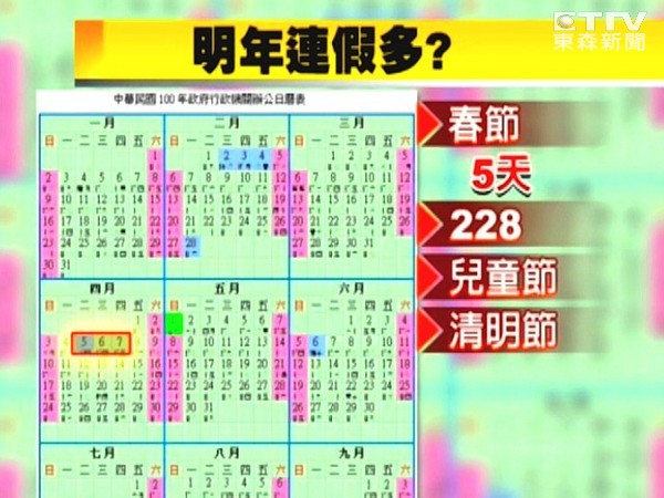網路盛傳民國102年,包括228和平紀念日、清明節、中秋節、國慶日都有4天連假;不過,行政院人事行政總處18日表示,明年度辦公日曆表還沒定案,而農曆春節目前是以放9天及6天兩案報請行政院核定中,一切尚未定案,最慢會在9月中旬前公布。