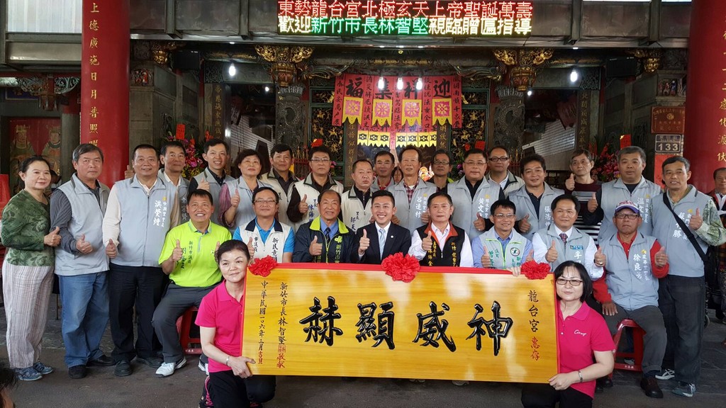 今天(30日)是農曆3月3日玄天上帝萬壽,新竹市長林智堅在民政處長張力可的陪同下,分別前往同是主祀玄天上帝的寺廟─龍台宮與北極殿,向玄天上帝上香祈福祝壽,贈匾「神威顯赫」,恭賀萬壽無疆。議員曾資程、鄭貴元、余邦彥、劉聲正、東區區長李吳喜、北區區長彭啟峰與多位里長也一同出席。