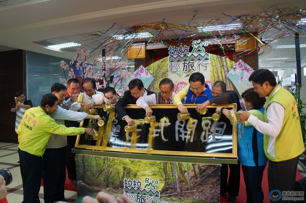 ▲桃園市政府原民局全力發展部落觀光旅遊,將裝滿金砂的瓶子倒入活動主題(上圖),期力朝點石成金(▼下圖)的觀光產業前進。(圖/記者楊淑媛攝)