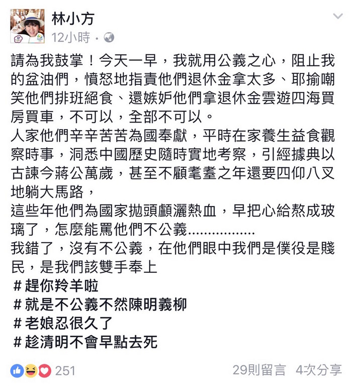 林育卉在臉書發文指出,「請為我鼓掌,今天一早,我就用公義之心,阻止我的盆油們,憤怒地指責他們退休金拿太多、耶揄嘲笑他們排班絕食、還嫉妒他們拿退休金雲遊四海買房買車,不可以,全部不可以。人家他們辛辛苦苦為國奉獻,平時在家養生益食觀察時事,洞悉中國歷史隨時實地考察,引經據典以古諫今蔣公萬歲,甚至不顧耄耋之年還要四仰八叉地躺大馬路,這些年他們為國家拋頭顱灑熱血,早把心給熬成玻璃了,怎麼能罵他們不公義...我錯了,沒有不公義,在他們眼中我們是僕役是賤民,是我們該雙手奉上」。