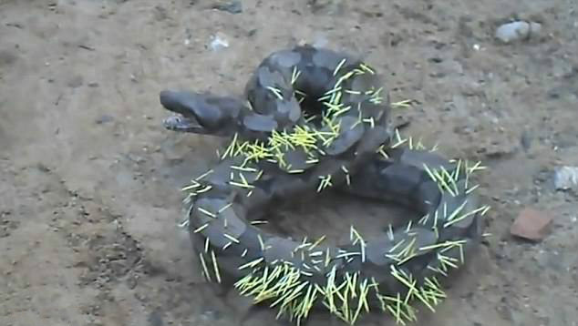 巴西一條蟒蛇試圖把一隻豪豬吃掉,但牠的獵食計畫不但沒有成功,反而還身受重傷。受傷的蟒蛇後來被一名男子發現,全身上下都扎滿豪豬的刺,還被男子帶來的狗狂吼,只能勉強地擺出防衛姿勢,看起來非常痛苦。