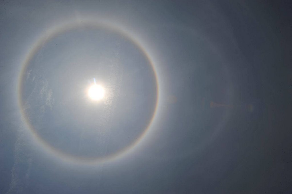 中央氣象局科技中心主任鄭明典31日PO出一張美麗的日暈照片,分享自文大大氣系劉清煌老師,這是以太陽為中心的圓是常見的22度暈,「最罕見的則是照片中太陽右側淡淡的圓,稱為是幻日環(Parhelic circle) ,或許,這是在台灣拍到唯一的一張完整而小的幻日環照片!」