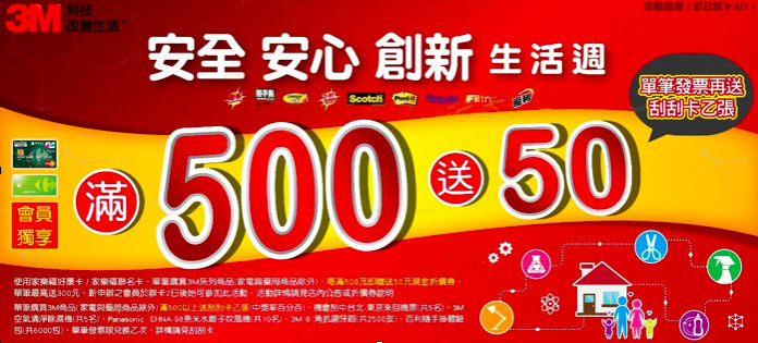 3M品牌嘉年華於即日起至4/11(二) 在全台家樂福門市正式展開。活動期間,除了有百種3M熱銷商品以超優惠價格回饋消費者外,當日3M產品單筆消費滿500元,再送50元現金折價券。憑發票可再兌換刮刮卡乙張,頭獎是市價28,000元的東京來回機票,還有機會刮中市價15,000元的3M空氣清淨除濕機,共有8,500多項3M好禮,100%中獎率,喜愛3M 產品的消費者們,千萬不能錯過這麼好康的優惠!
