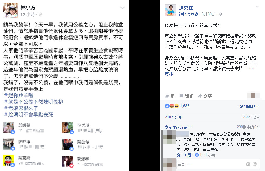 不過,林育卉貼文引發軒然大波外,令人驚訝的是,國民黨主席洪秀柱還在臉書上貼出截圖,發現邱議瑩、吳思瑤、民進黨發言人阮昭雄、前立委蔡啟芳、立院副院長特助蔡克斯、蔡英文競選發言人黃海寧等人,都對林育卉那篇怒罵退休軍公教的貼文按讚。