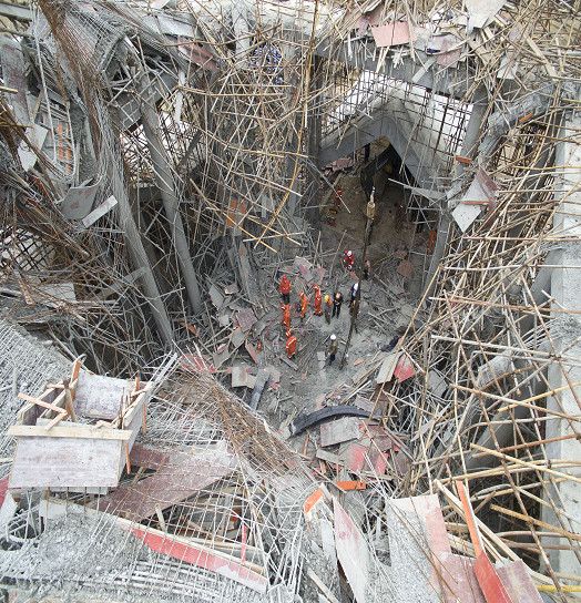 救援過程中,由於垮塌下來的混凝土體量較大,且逐步凝固硬化,現場腳手架縱橫交錯,受困人員被鋼筋混凝土和腳手架包裹,施工空間狹窄。同時,為避免傷者受到二次傷害,防止發生次生災害,救援現場只能採用小型機械加人工作業方式。