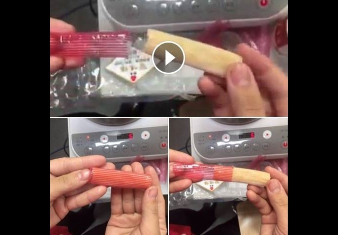女網友在「爆廢公社」po文說「現在連蟹味棒都要跟我過愚人節,你的紅線呢?!」影片中,這盒蟹肉棒把外頭塑膠膜拆開,原形畢露,變成「全裸」原色蟹味棒,跟一般大家吃到的、有紅色線條的產品不一樣。
