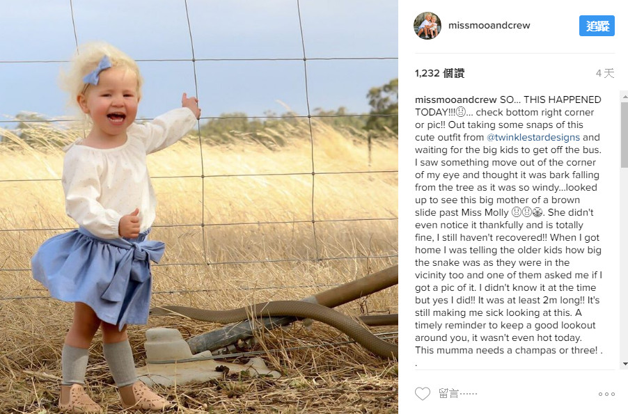 ▲2歲女童燦笑拍照,「世界第二毒蛇」從腳邊路過...媽嚇壞。(圖/翻攝自IGmissmooandcrew)