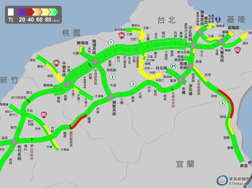 高公局預計下午2時開始,國1北上斗南-埔鹽系統、台中系統-后里;國3北上竹山-中興、中港系統-大甲、竹南-西濱、龍潭-鶯歌系統;國5北上頭城-坪林等路段,可能出現車多壅塞情形。