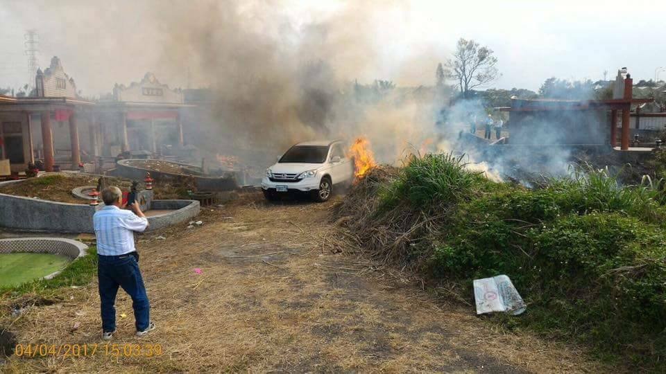 一名網友在臉書公開社團「台灣新聞記者聯盟&爆料平台」貼出照片,表示桃園4日下午發生一起疑似掃墓燒草卻不慎延燒休旅車的意外,笑稱「桃園大戶人家看到昨天飛越墓地的新聞,跟對方拼了!用燒的!百善孝為先,這子孫有孝順,燒一台CRV孝敬祖先!」