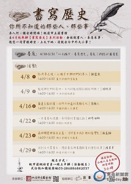 ▲桃園市立圖書館4月份起,與知名網路社群【故事:寫給所有人的歷史】編輯團隊撰稿作家合作,舉辦「書寫歷史-你所不知道的那些人那些事」系列講座活動。(圖/桃園市立圖書館提供)