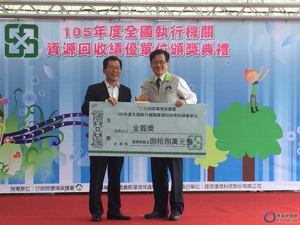 ▲環保署全國資源回收工作績效考核,台南市政府連續第7年榮獲第一組金質獎,環保局長李賢衛(右)7日出席環保署頒獎典禮接受頒獎表揚。(圖/環保局提供)