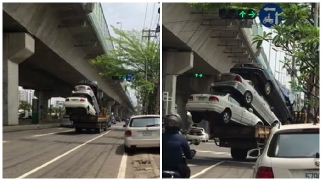 從影片可看到,貨車上載著3輛似乎損毀的轎車,3輛車如同「疊疊樂」一樣疊起,隨著貨車移動還跟著搖晃,令許多用路人大吃一驚,後方沒有車輛敢靠近這輛「神貨車」,深怕一個不小心,自己就變第4輛載走了。
