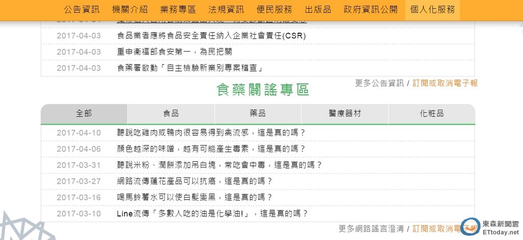 ▲衛生福利部食品藥物管理署網站,設置食藥闢謠專區,提供民眾正確的食藥相關議題,解開網路上不實的謠言。(圖/記者林悅翻攝)