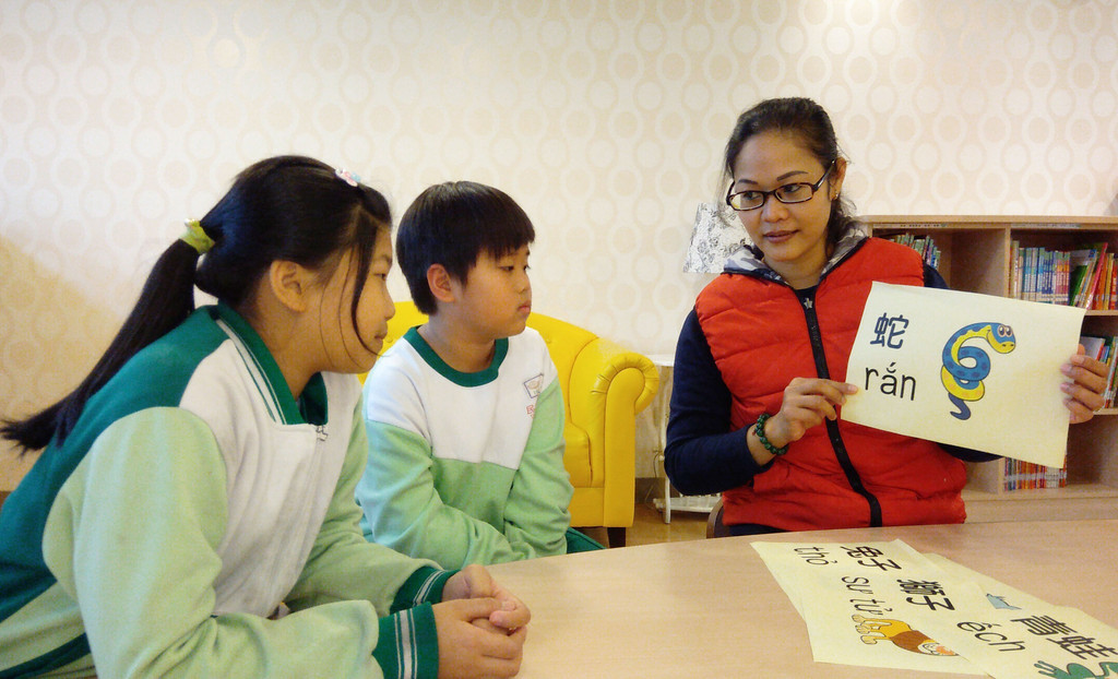 新北市立圖書館新莊裕民分館於每周三推出「越說越好」陪讀活動,由來自越南的新住民媽媽擔任陪讀天使,教新二代陪讀學童越南生活用語、朗讀越南語故事繪本,一雙兒女則是媽媽的小助教,幫忙同學正確發音與協助翻譯!