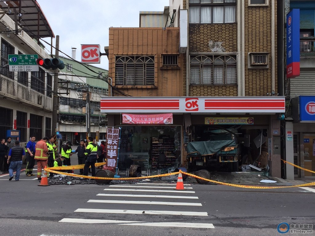 警方調查,許姓司機(39歲)今日中午駕駛小貨車滿載鋼筋續接器,從淡水奎柔山路(北八線)下山往淡金公路行駛,但當接近淡金路三段與奎柔山路路口時,因煞車失靈再加上車子載重下坡衝力過大,遂直接闖紅燈衝入淡金公路;先撞擊謝姓司機(38歲)所駕大貨車尾部,隨即再撞入對面OK便利超商內。