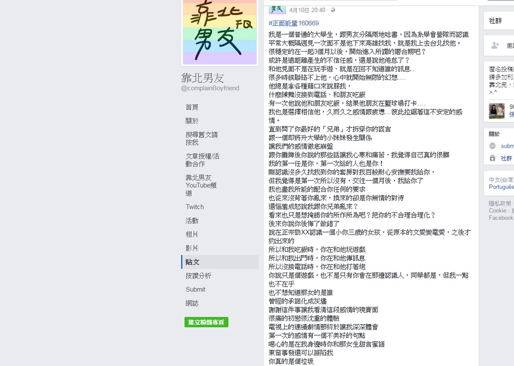 原po說,男友是初戀,交往後也把「第一次」給了他,平常也是也盡所能的配合任何要求,最誇張的是,自己從來沒背著他亂來,換來的卻是無情的對待,為了掩飾他的所作所為,還抹黑她跟別人亂來;女網友最後還自我安慰地說:「謝謝這件事讓我看清這段感情的現實面,讓我深深體會電視上的連續劇情節」。