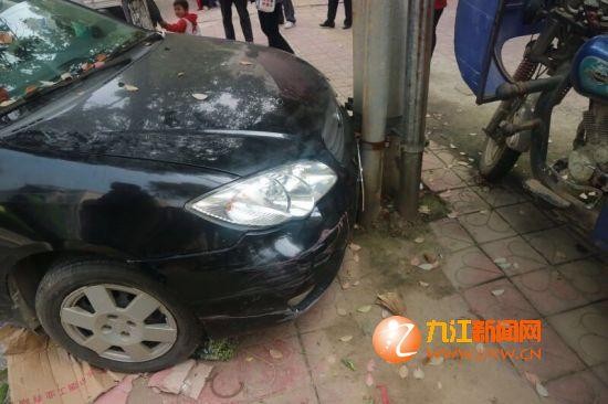 ▲3歲娃開車撞歪電線桿。(圖/翻攝自九江新聞網)