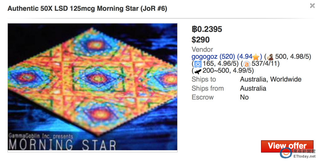 ▼暗網上「夢想市集」所販賣的LSD,50張大約台幣9千元來源是澳洲。(圖/翻攝畫面)