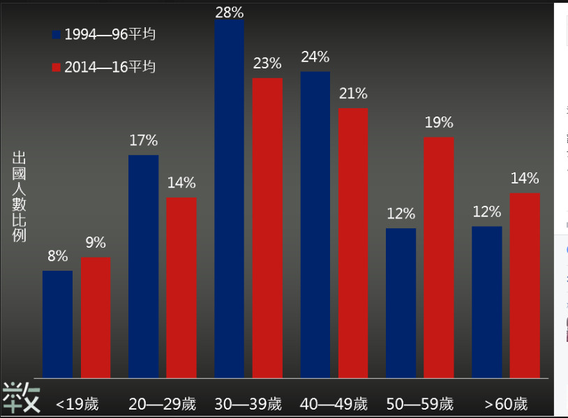 數感實驗室找出1994~1996年以及2014~2016年的出國年齡層分布,發現20~29與30~39歲這兩個年齡層出國的人次,其實比20年前分別低了3%與5%。