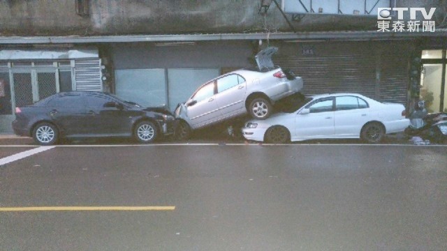 陳姓男子今天凌晨4點30分左右,開著黑色轎車行經東大路,往南寮的方向,突然失控衝上對向車道,逆向撞上一台銀色轎車,撞擊力道太大,銀色轎車車頭被撞凹,整台車被頂起來,車尾壓到後面一台轎車的車頭,還有一輛機車被卡在中間,形成3台車疊疊樂的場面,讓受害的銀色轎車車主超傻眼,目擊民眾說,「半夜聽到巨大的撞擊聲,趕緊過來查看。」